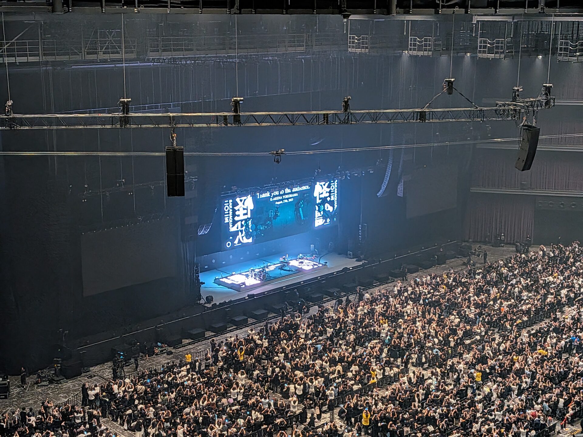 会場は横浜のKアリーナ。ここに来るのも初めて。座席は一番安いところ。最上階でしかも急斜面。慣れるまで怖かった。ステージまでは遠いけど、視界は開けていて気持ちいい。ライブ映像を見て楽しみにしていたサカナクション特有の光の演出も十分に体感することができた。近ければもっとすごく感じられるのかもしれないけど。
